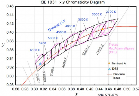 ANSI(美國國家標(biāo)準(zhǔn)組織)C78-377A 號(hào)文件使用四步MacAdam橢圓定義的方法作為CFL(小型熒光燈)和鹵素?zé)糁圃斓臉?biāo)準(zhǔn)。每一步代表了一片面積,該面積區(qū)域里的任何一個(gè)點(diǎn)都是離中心點(diǎn)一個(gè)標(biāo)準(zhǔn)差。